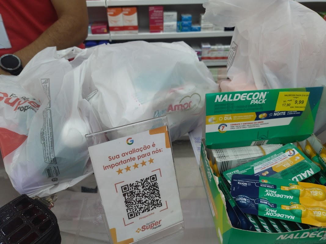 A Drogaria Super Popular oferece a venda de medicamentos, produtos de higiene, beleza, além de serviços de aferição de pressão e consultas com farmacêuticos.